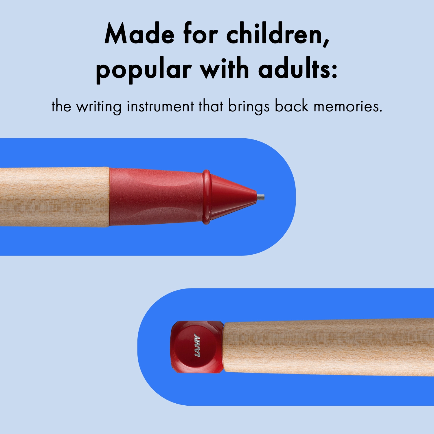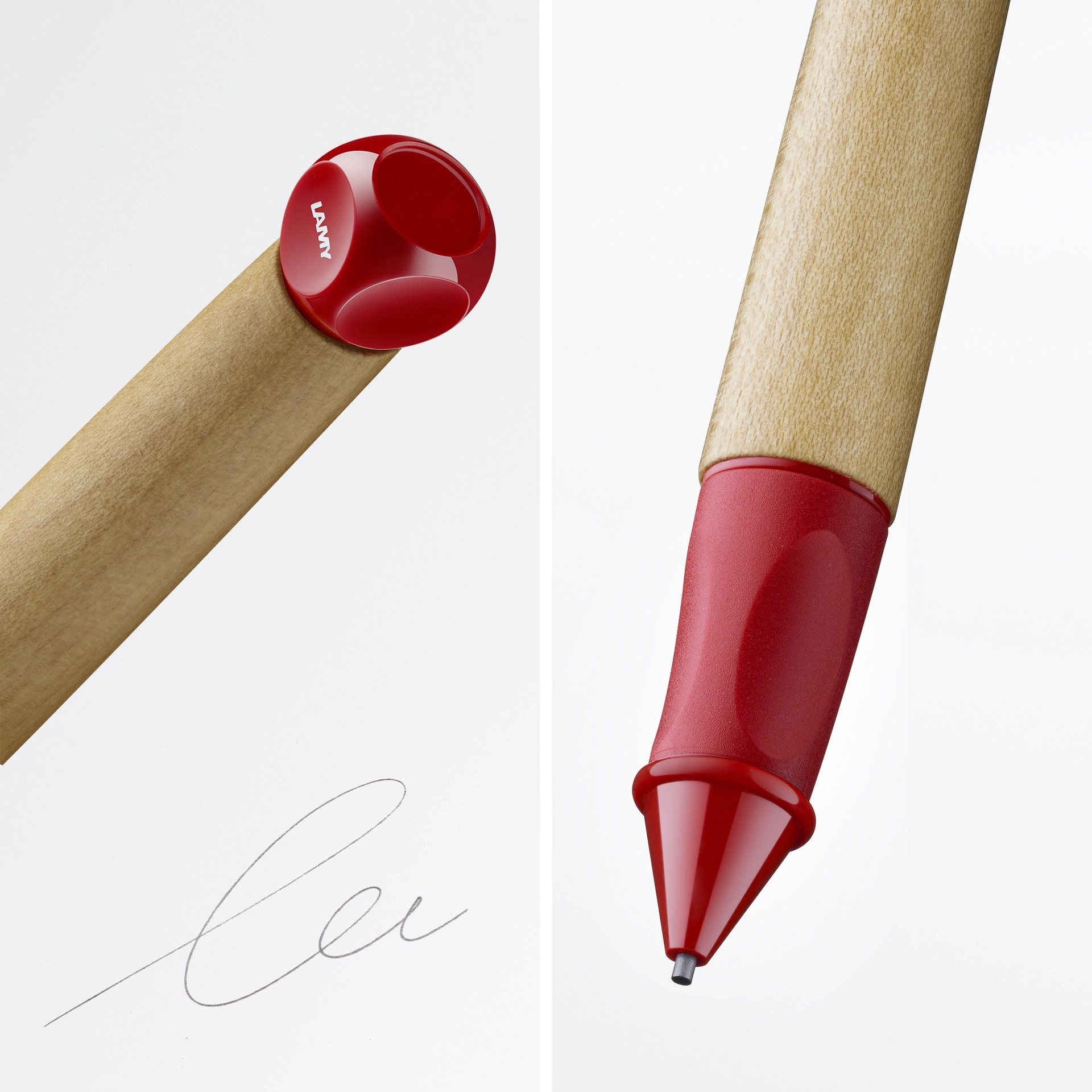 Schreiblernstift aus Ahornholz, Kappe und Würfel aus Kunststoff rot, rutschfestes, gummiertes Griffstück, M44 1,4mm