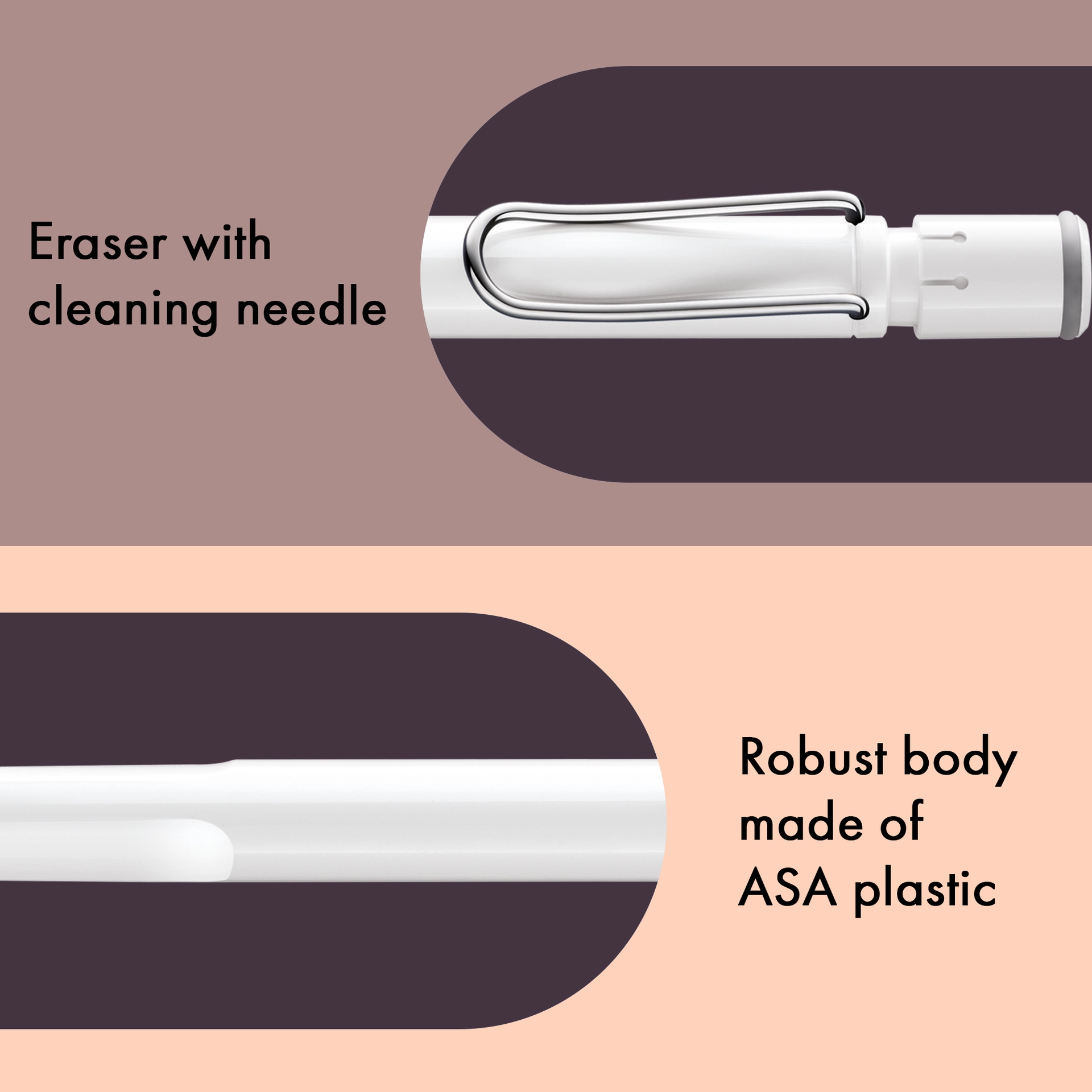 Aus robustem ABS-Kunststoff, griffsympathisch durch markante Griffmulden, mit verchromtem, selbstfederndem Metallclip