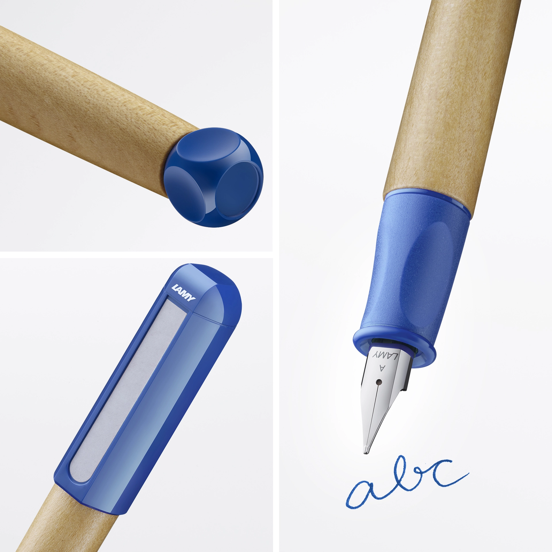 Schreiblernfüller aus Ahornholz, Kappe und Würfel aus Kunststoff blau, rutschfestes, gummiertes Griffstück, Stahlfeder, poliert