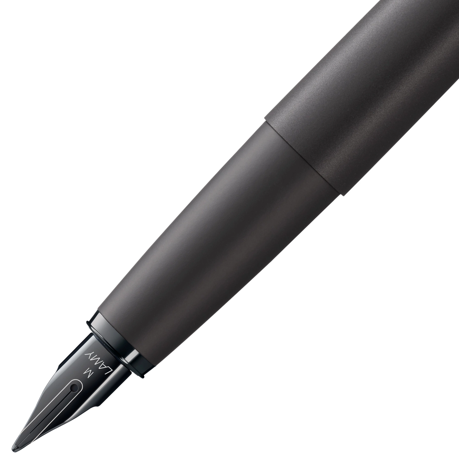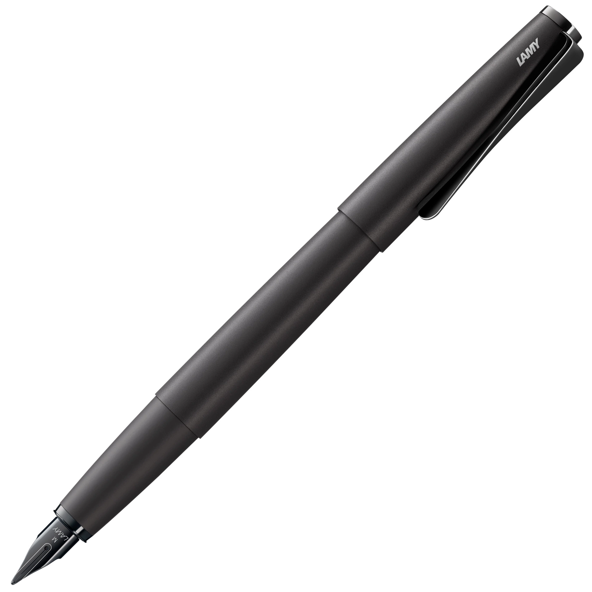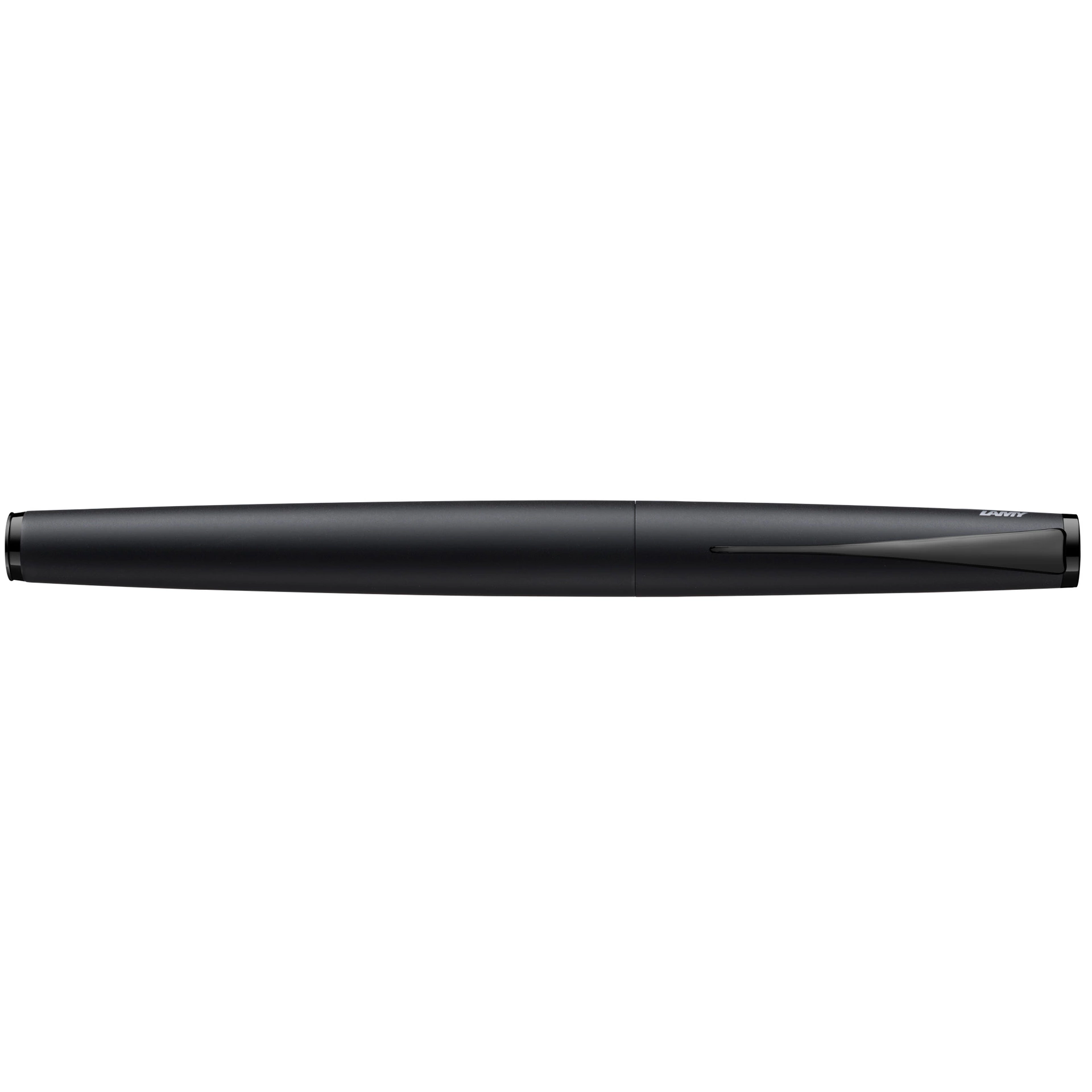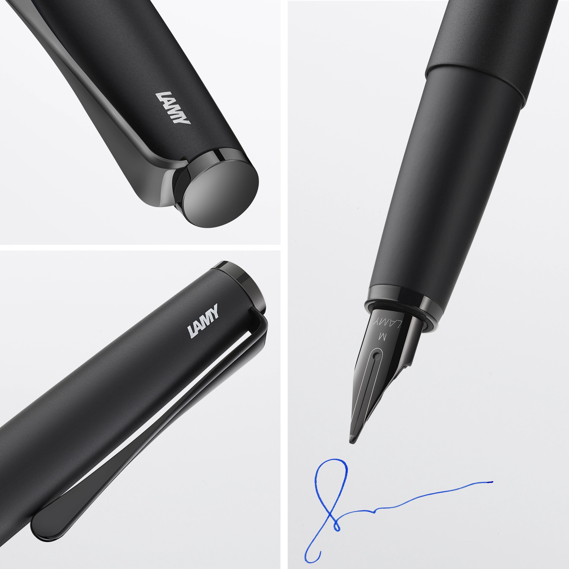 Aus rostfreiem Edelstahl, Kappe mit propellerförmigem, verchromtem Edelstahlclip, Großraum-Tintenpatrone LAMY T 10 blau Der LAMY studio Lx all black in schwarzem Mat tlack-Finish und schwarz glänzender PVD Beschichtung an Clip und Feder.