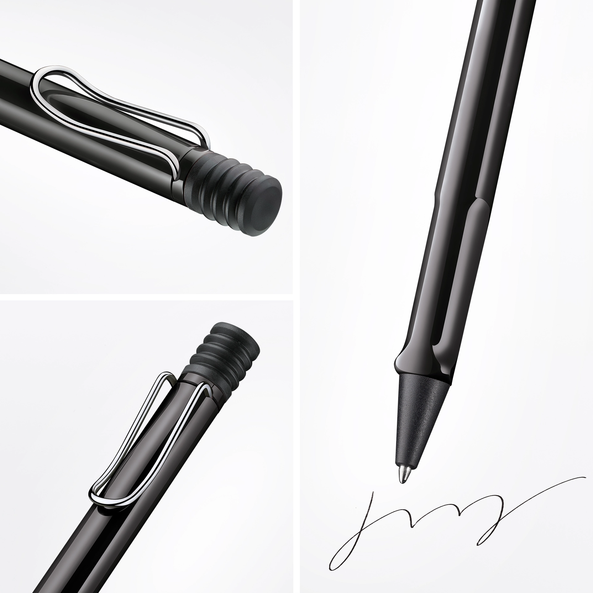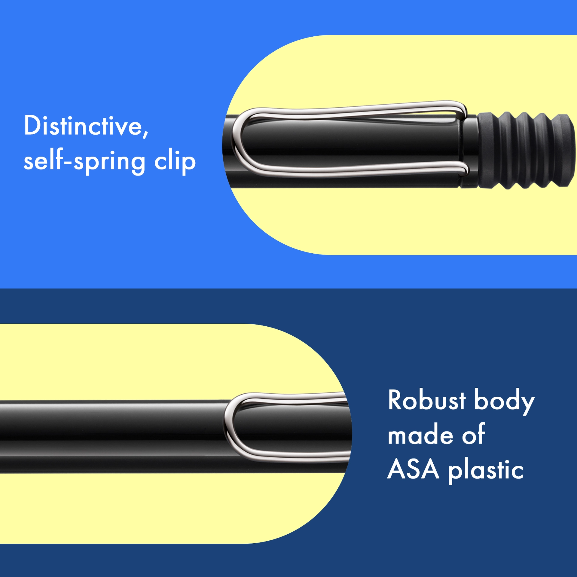 Der LAMY safari ist mehr als die Summe seiner Details: Er ist ästhetisch, robust und individuell. Der markante, selbstfedernde Clip hält das Schreibgerät sicher an Ort und Stelle befestigt. Das Gehäuse aus schlagzähem Kunststoff macht ihn zum robusten Begleiter in jedem Umfeld und die abgeflachte Form verhindert versehentliches Wegrollen. Funktionale Details wie subtil ergonomisch geformte Griffflächen und ein Sichtfenster zur Kontrolle des Tintenstands fügen sich wie selbstverständlich in das Design ein und machen den LAMY safari zum modernen Klassiker.