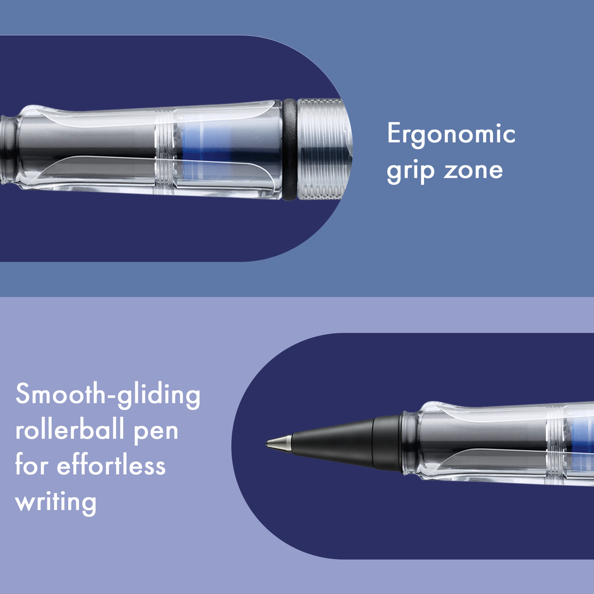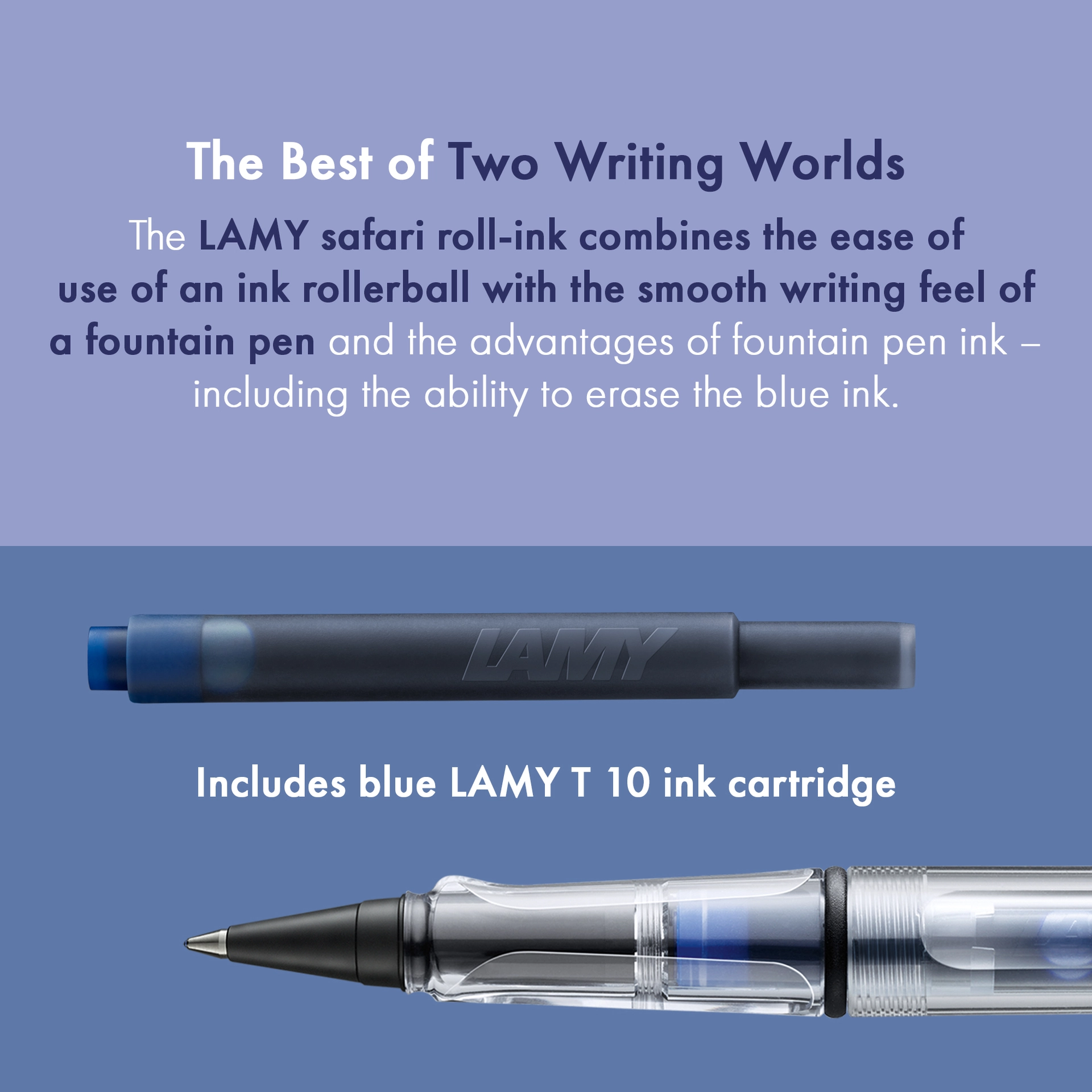 Der LAMY safari roll-ink verbindet die unkomplizierte Handhabung eines Tintenrollers mit dem flüssigen Schreibgefühl eines Füllhalters und den Vorzügen Der Füllhaltertinte - inklusive der Möglichkeit, die blaue Tinte zu löschen. Tintenpatronenroller aus robustem ASA-Kunststoff white hochglänzend mit hochwertigem Metallclip und ergonomischem Griffstück für ein komfortables Schreibgefühl. Wird mit einer blauen LAMY T10 Tintenpatrone geliefert.