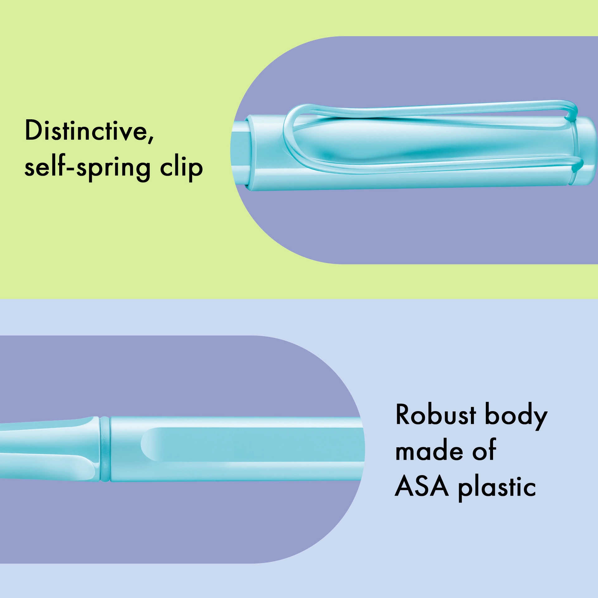 Der LAMY safari ist mehr als die Summe seiner Details: Er ist ästhetisch, robust und individuell. Der markante, selbstfedernde Clip hält das Schreibgerät sicher an Ort und Stelle befestigt. Das Gehäuse aus schlagzähem Kunststoff macht ihn zum robusten Begleiter in jedem Umfeld und die abgeflachte Form verhindert versehentliches Wegrollen. Funktionale Details wie subtil ergonomisch geformte Griffflächen und ein Sichtfenster zur Kontrolle des Tintenstands fügen sich wie selbstverständlich in das Design ein und machen den LAMY safari zum modernen Klassiker.