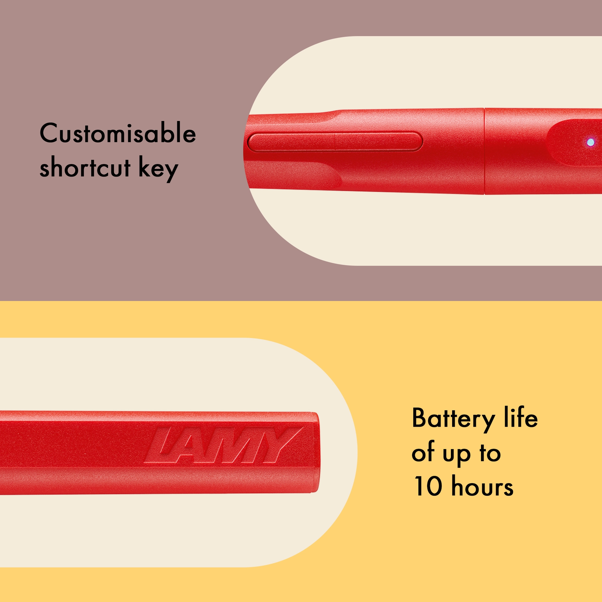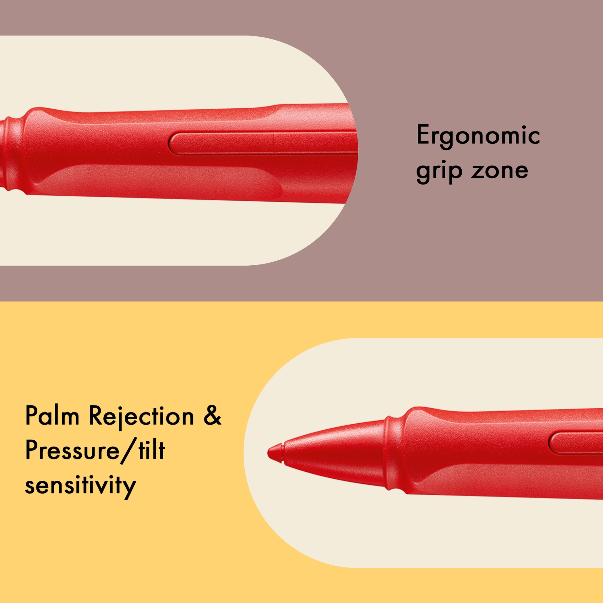 Ergonomische Griffzone; Zwei konfigurierbare Funktionstasten*; weiche, auswechselbare Spitze; selbstfedernder Bügelclip; Kappe zum Schutz der Spitze; USB-C Ladefunktion; Handballenerkennung; Druckempfindlichkeit*; Neigungsempfindlichkeit; keine Koppelung erforderlich; Bis zu 10 Stunden Akkulaufzeit; 1 Stunde Batterieladezeit