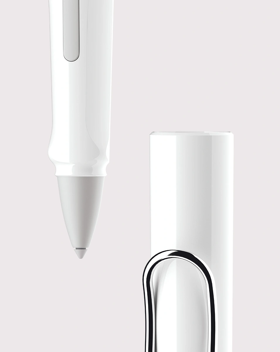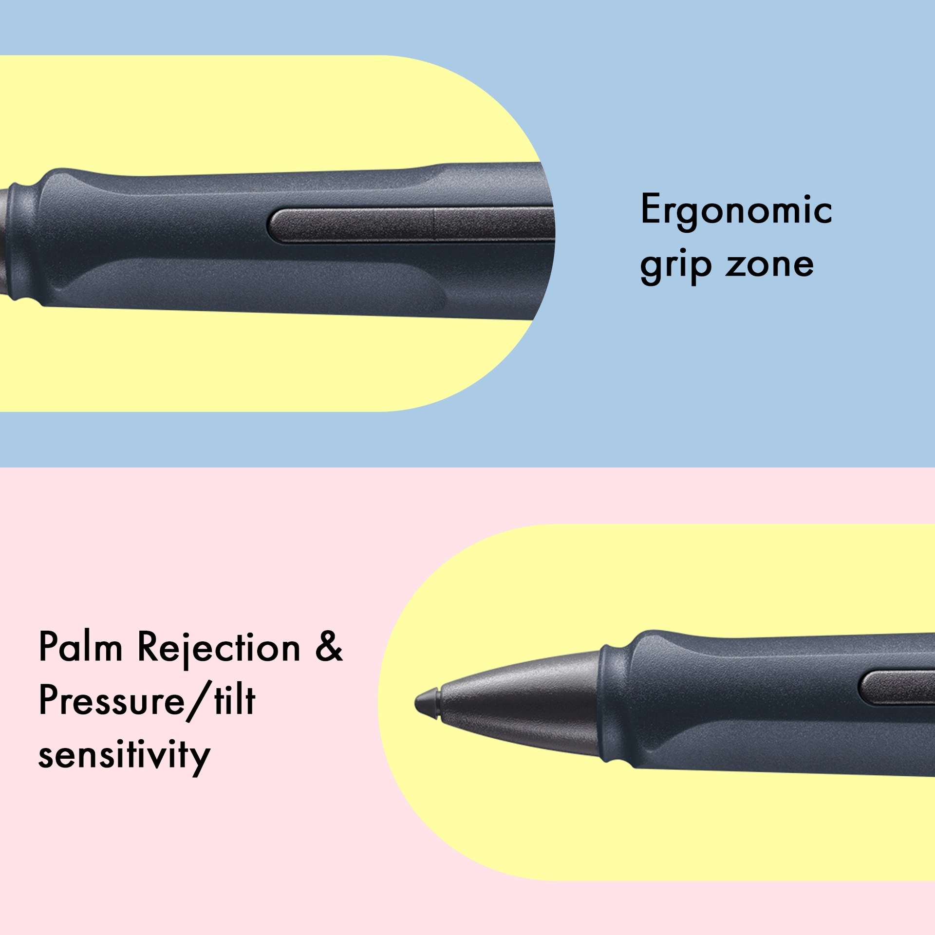 Ergonomische Griffzone; Zwei konfigurierbare Funktionstasten*; weiche, auswechselbare Spitze; selbstfedernder Bügelclip; Kappe zum Schutz der Spitze; USB-C Ladefunktion; Handballenerkennung; Druckempfindlichkeit*; Neigungsempfindlichkeit; keine Koppelung erforderlich; Bis zu 10 Stunden Akkulaufzeit; 1 Stunde Batterieladezeit