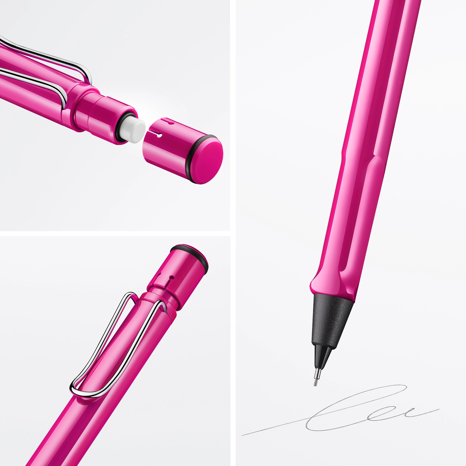 Der LAMY safari ist mehr als die Summe seiner Details: Er ist ästhetisch, robust und individuell. Der markante, selbstfedernde Clip hält das Schreibgerät sicher an Ort und Stelle befestigt. Das Gehäuse aus schlagzähem Kunststoff macht ihn zum robusten Begleiter in jedem Umfeld und die abgeflachte Form verhindert versehentliches Wegrollen. Funktionale Details wie subtil ergonomisch geformte Griffflächen und ein Sichtfenster zur Kontrolle des Tintenstands fügen sich wie selbstverständlich in das Design ein und machen den LAMY safari zum modernen Klassiker.