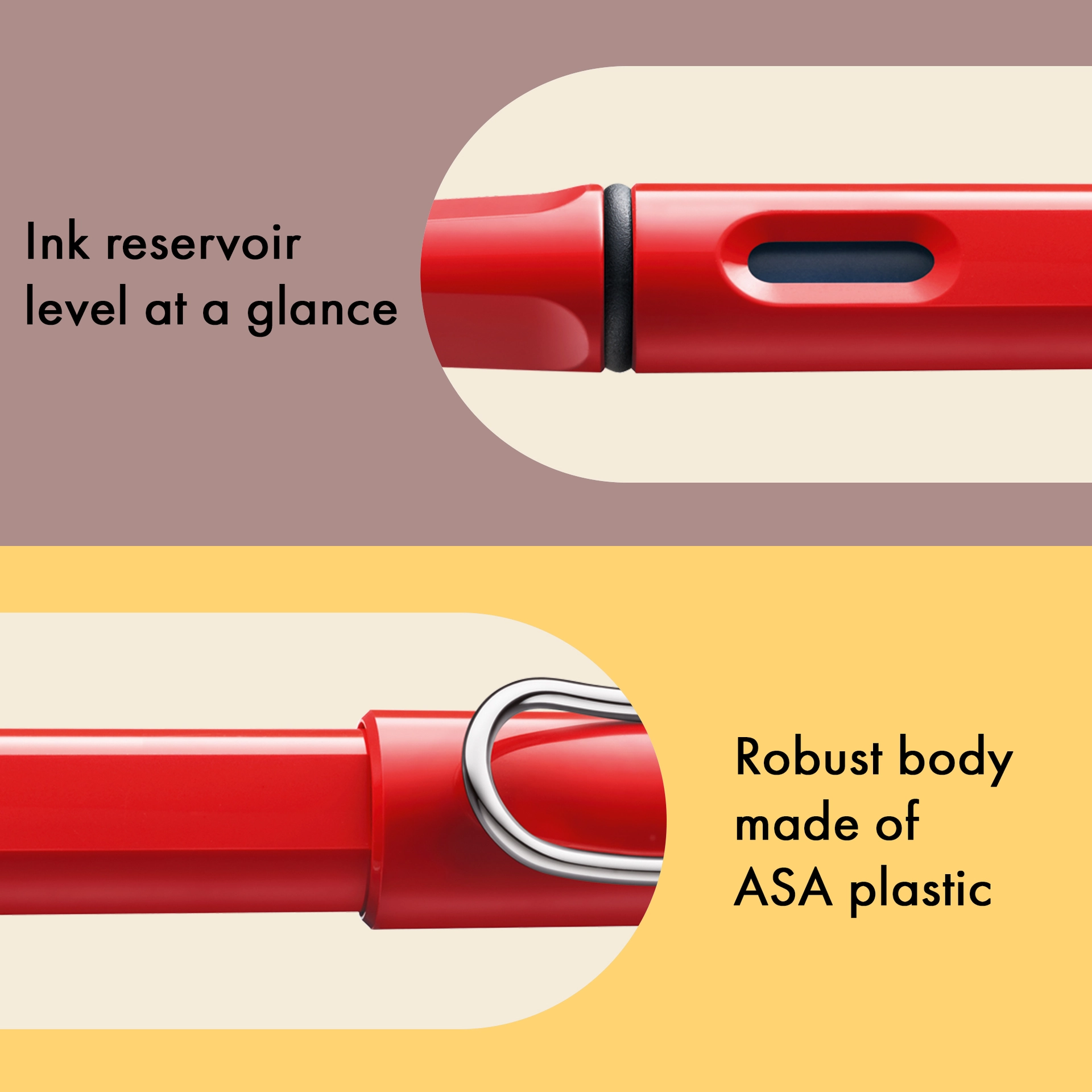 Der LAMY safari ist mehr als die Summe seiner Details: Er ist ästhetisch, robust und individuell. Der markante, selbstfedernde Clip hält das Schreibgerät sicher an Ort und Stelle befestigt. Das Gehäuse aus schlagzähem Kunststoff macht ihn zum robusten Begleiter in jedem Umfeld und die abgeflachte Form verhindert versehentliches Wegrollen. Funktionale Details wie subtil ergonomisch geformte Griffflächen und ein Sichtfenster zur Kontrolle des Tintenstands fügen sich wie selbstverständlich in das Design ein und machen den LAMY safari zum modernen Klassiker.