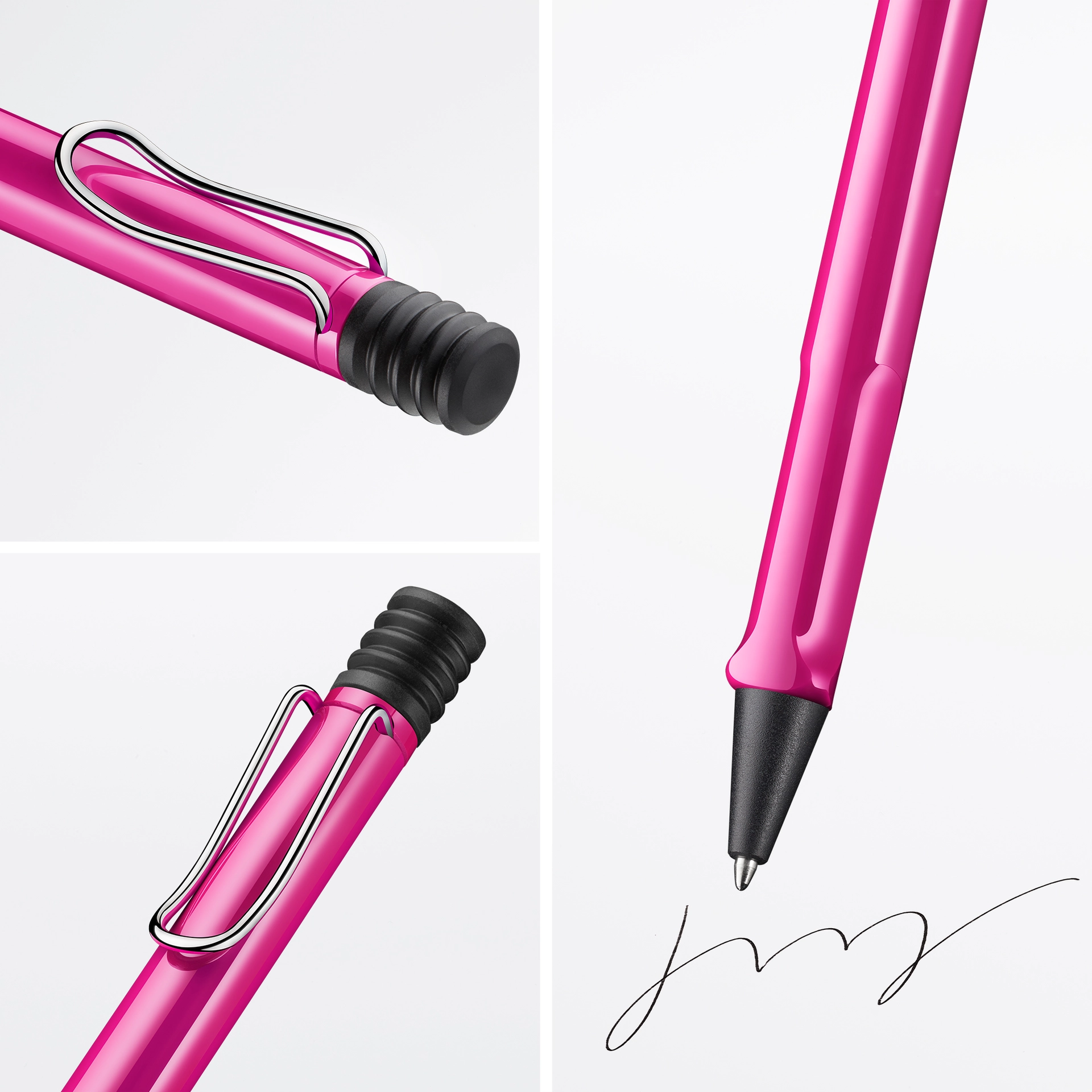 Aus robustem ASA-Kunststoff, pink hochglänzend. Griffsympathisch durch markante Griffmulden. Mit verchromtem Metallclip. Kugelschreiber mit LAMY Großraummine M 16 schwarz M.