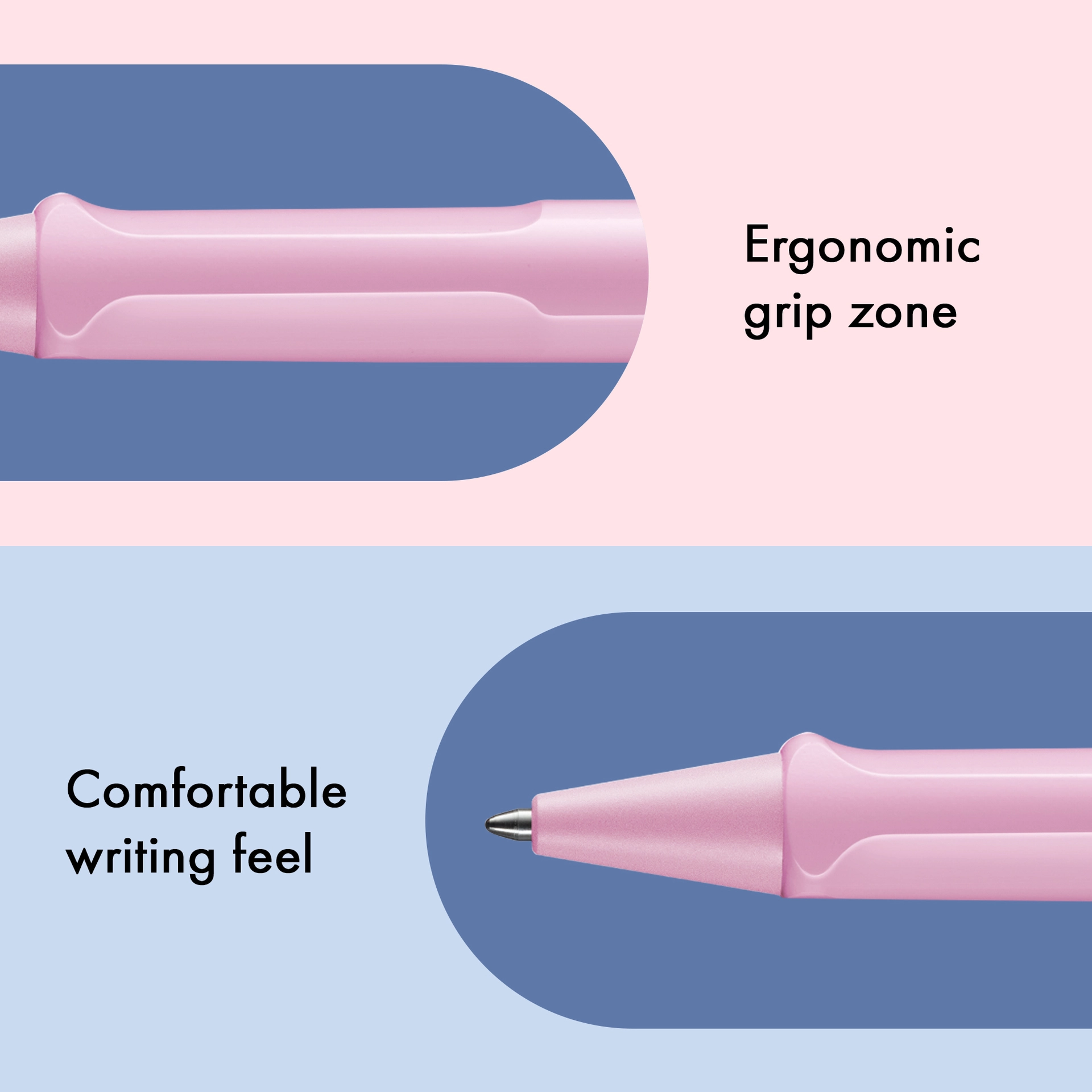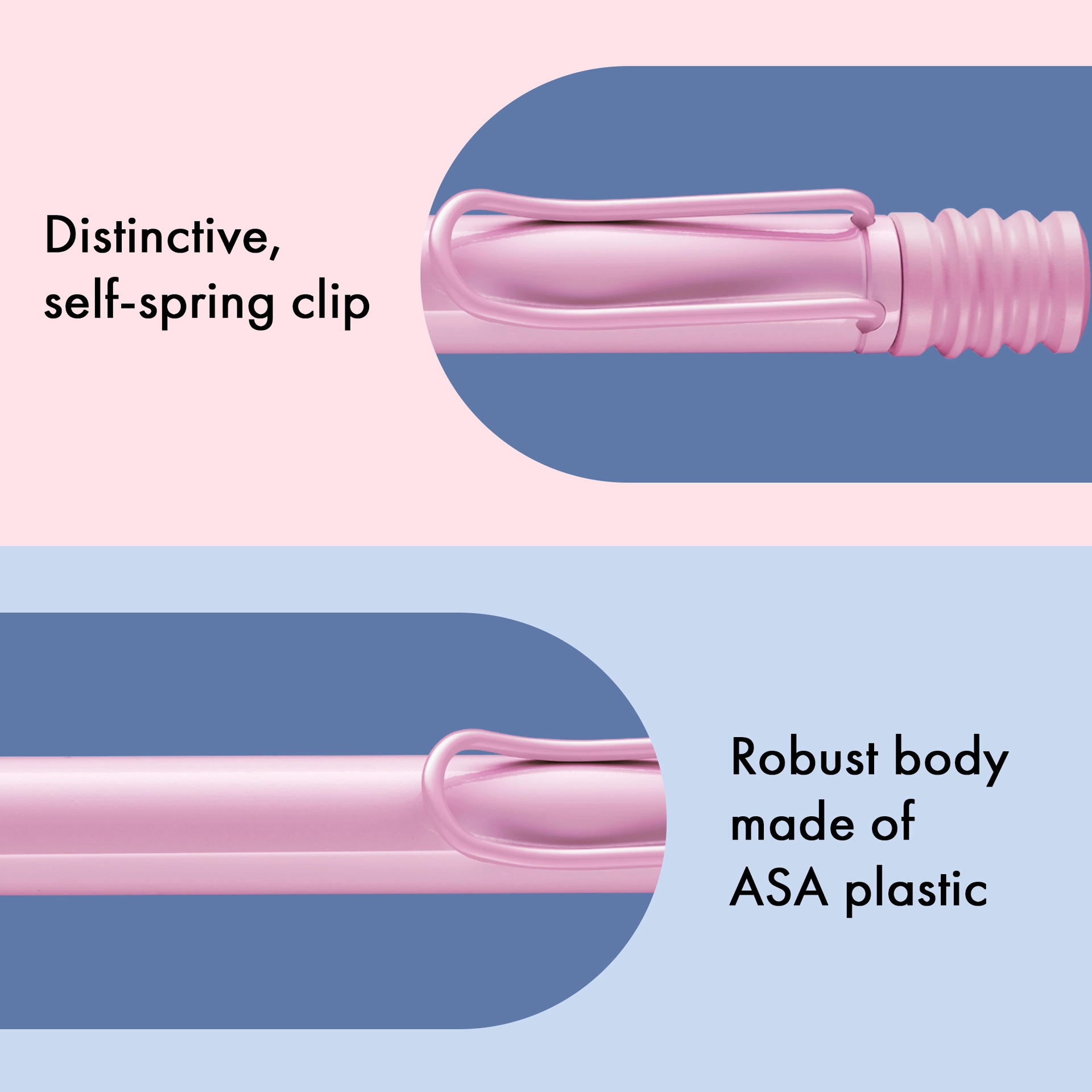Der LAMY safari ist mehr als die Summe seiner Details: Er ist ästhetisch, robust und individuell. Der markante, selbstfedernde Clip hält das Schreibgerät sicher an Ort und Stelle befestigt. Das Gehäuse aus schlagzähem Kunststoff macht ihn zum robusten Begleiter in jedem Umfeld und die abgeflachte Form verhindert versehentliches Wegrollen. Funktionale Details wie subtil ergonomisch geformte Griffflächen und ein Sichtfenster zur Kontrolle des Tintenstands fügen sich wie selbstverständlich in das Design ein und machen den LAMY safari zum modernen Klassiker.