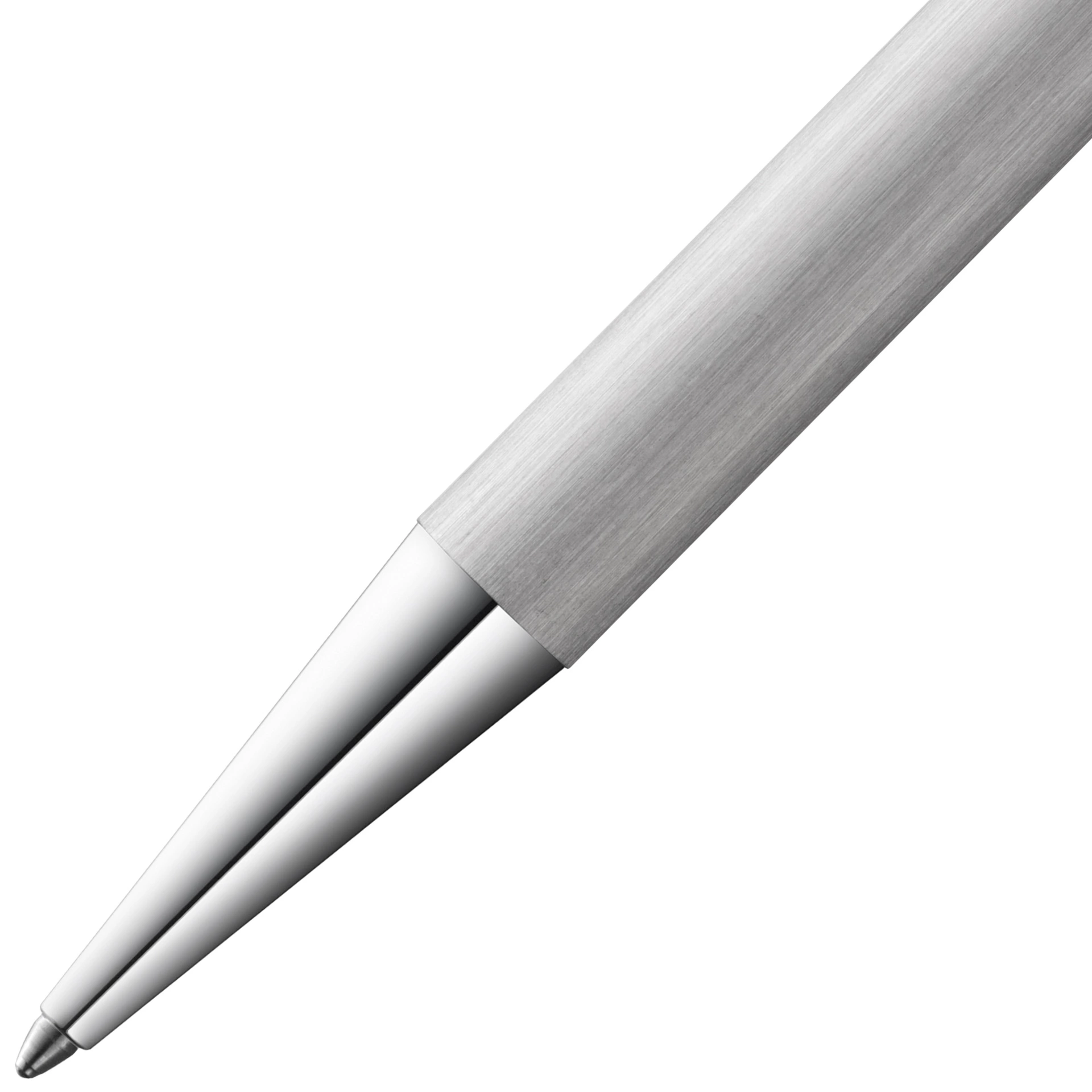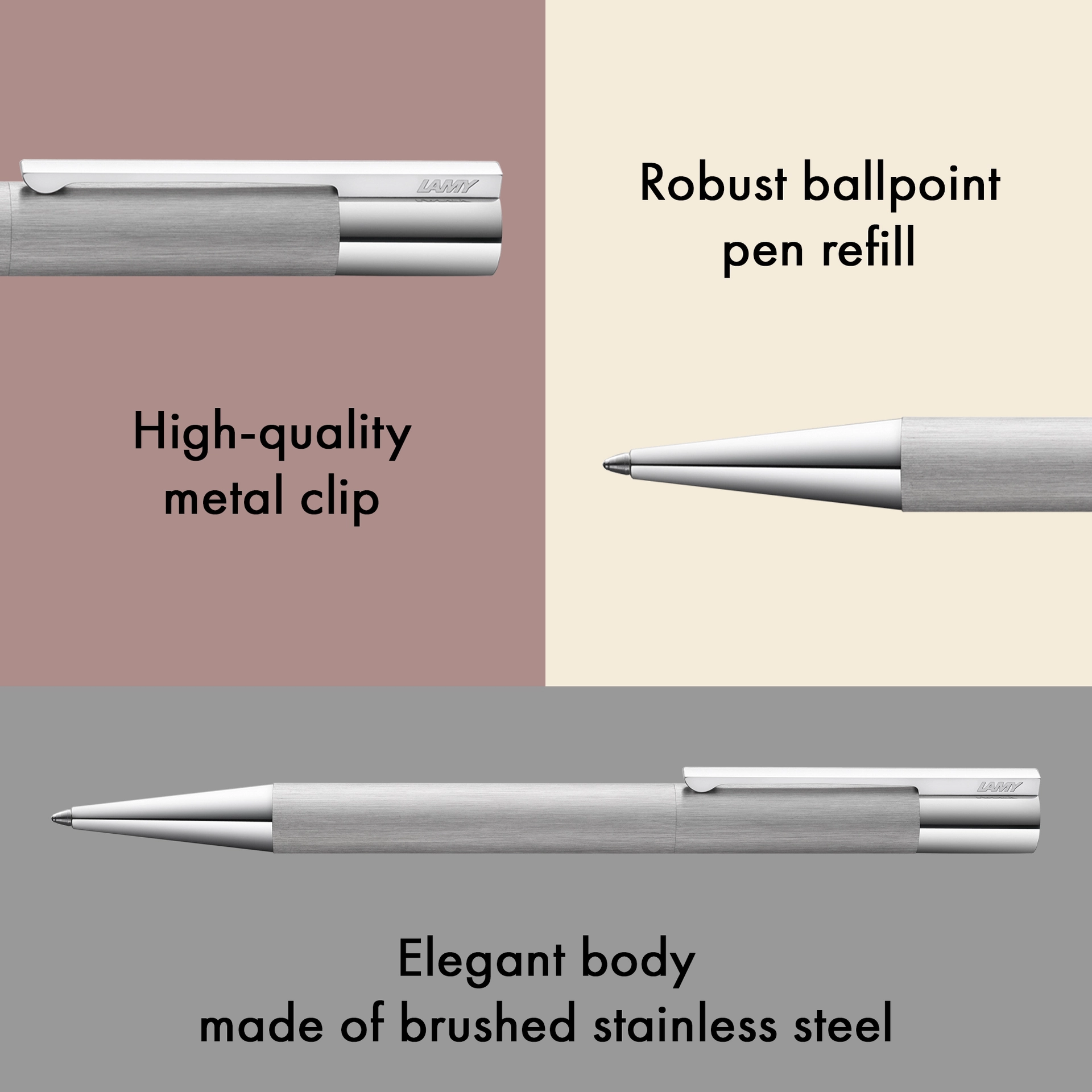 Der LAMY scala vereint puristische Formalität und emotionsgeladene Details. Durch bewusstes Verzichten auf materiellen Überfluss strahlt er eine edle Zurückhaltung aus, hinter der sich hochpräzise technische Detaillösungen verbergen: Die komplexe Mechanik der Schreibgeräte wird in der LAMY Manufaktur in Heidelberg komplett von Hand montiert. Der massive Clip und der Körper aus Ganzmetall verleihen der Serie eine robuste Eleganz, während das Griffstück aus poliertem Metall ein angenehmes Schreibgefühl bietet.