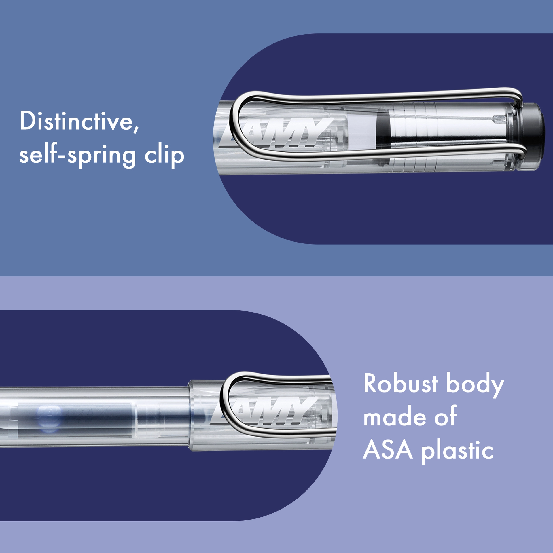 Der LAMY safari Füllhalter ist seit seiner Einführung in den 1980er Jahren ein geliebter Bestseller mit Kultstatus. Der LAMY safari roll-ink ergänzt die Reihe um einen innovativen Tintenpatronenroller, der mit Füllhaltertinte schreibt: Anstelle einer Tintenrollermine nutzt er die bekannte LAMY T 10 Tintenpatrone in Blau, wie sie auch im Füllhalter zum Einsatz kommt.
