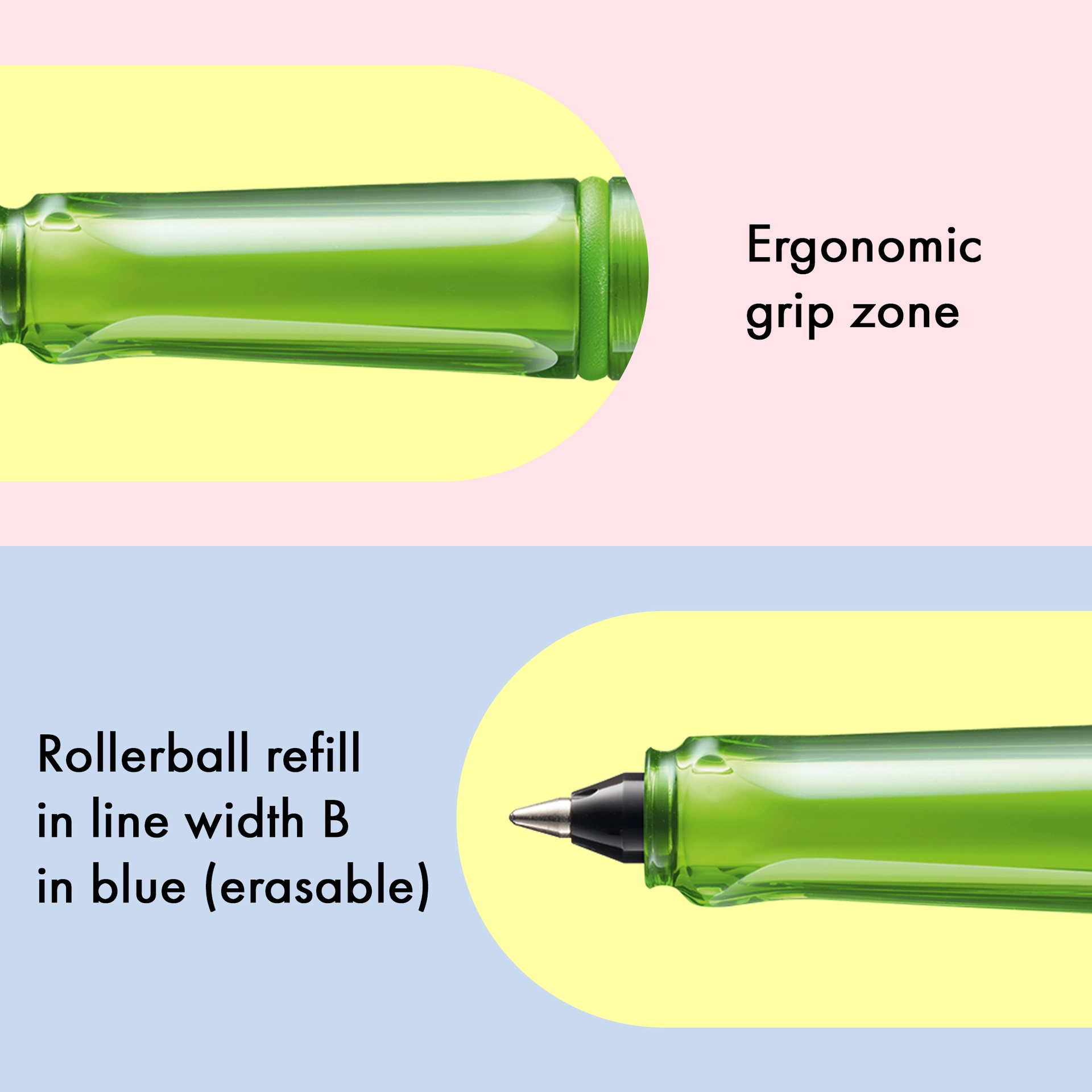 Der LAMY balloon ist ein farbenfroher Hingucker, der vor allem im Alltag und in den Händen von Vielschreiber:innen zur Höchstform aufläuft. Er basiert auf dem Design des ikonischen LAMY safari und ist der perfekte Begleiter für alle, die es bunt und modern mögen. Ein markanter, selbstfedernder Clip hält ihn sicher an Ort und Stelle befestigt, das transparente Gehäuse aus schlagzähem Kunststoff hält allen Herausforderungen stand und die abgeflachte Form verhindert versehentliches Wegrollen. Dank subtil ergonomisch geformter Griffflächen und einer nachfüllbaren Tintenrollerpatrone bietet er ein besonders angenehmes Schreibgefühl und macht einfach rundum gute Laune.