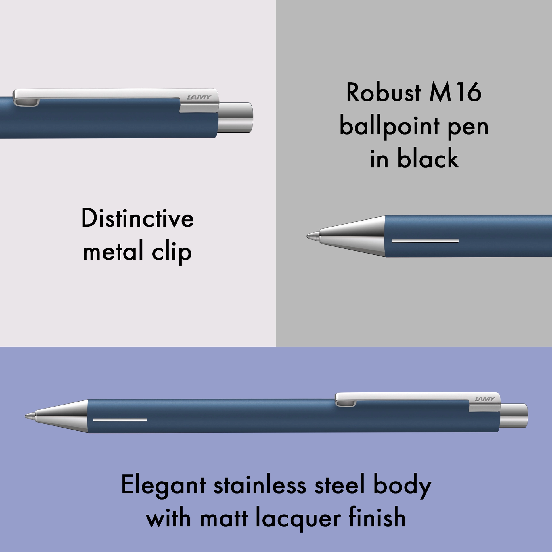 Der LAMY econ verkörpert pure Funktionalität und klare Ästhetik. Bei aller formalen Zurückhaltung und Sachlichkeit seines Ganzmetall-Körpers begeistert er dennoch mit einfallsreichen Details: Sein markant gebogener Clip und die neuartige Griffzone symbolisieren den Fokus auf das Wesentliche und gleichzeitig einen einzigartigen Sinn für ganz besondere gestalterische Akzente.